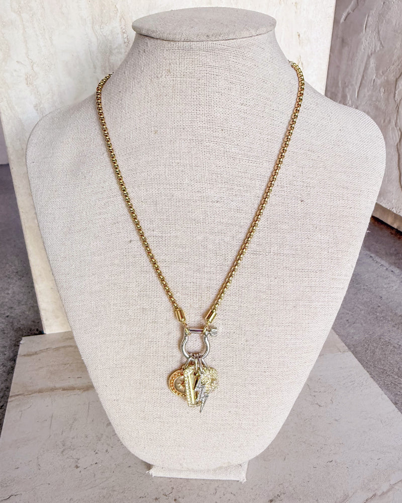 Horse Bit Mini- Is half the size of our Classic. It is cute and holds loads of Sweet Charms. 4 Charms. included. Lightning bolt Pavé, Id Tag, Star Tag Pavé, North Star Coin. All Charms are hand set CZ Screw opens at the Bit. Stainless steel Gold 14K Genuine gold plated Lobster Claw Clasp and Steel Chain and extender.