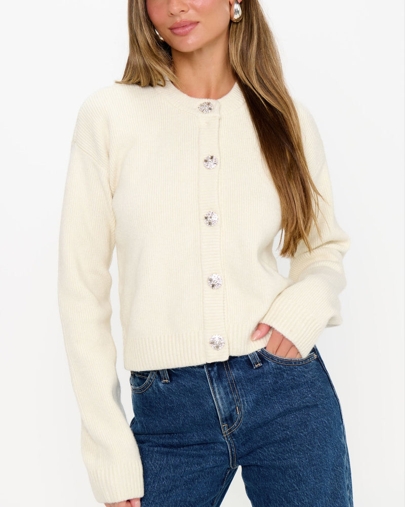 Add a touch of glam to any look with the Maggie Cardigan! This cream knit gets a playful upgrade with rhinestone-encrusted buttons that bring just the right amount of sparkle. Perfect with high-waisted skirts, denim, or layered over a slip dress, it’s the versatile piece that instantly makes any outfit more polished.