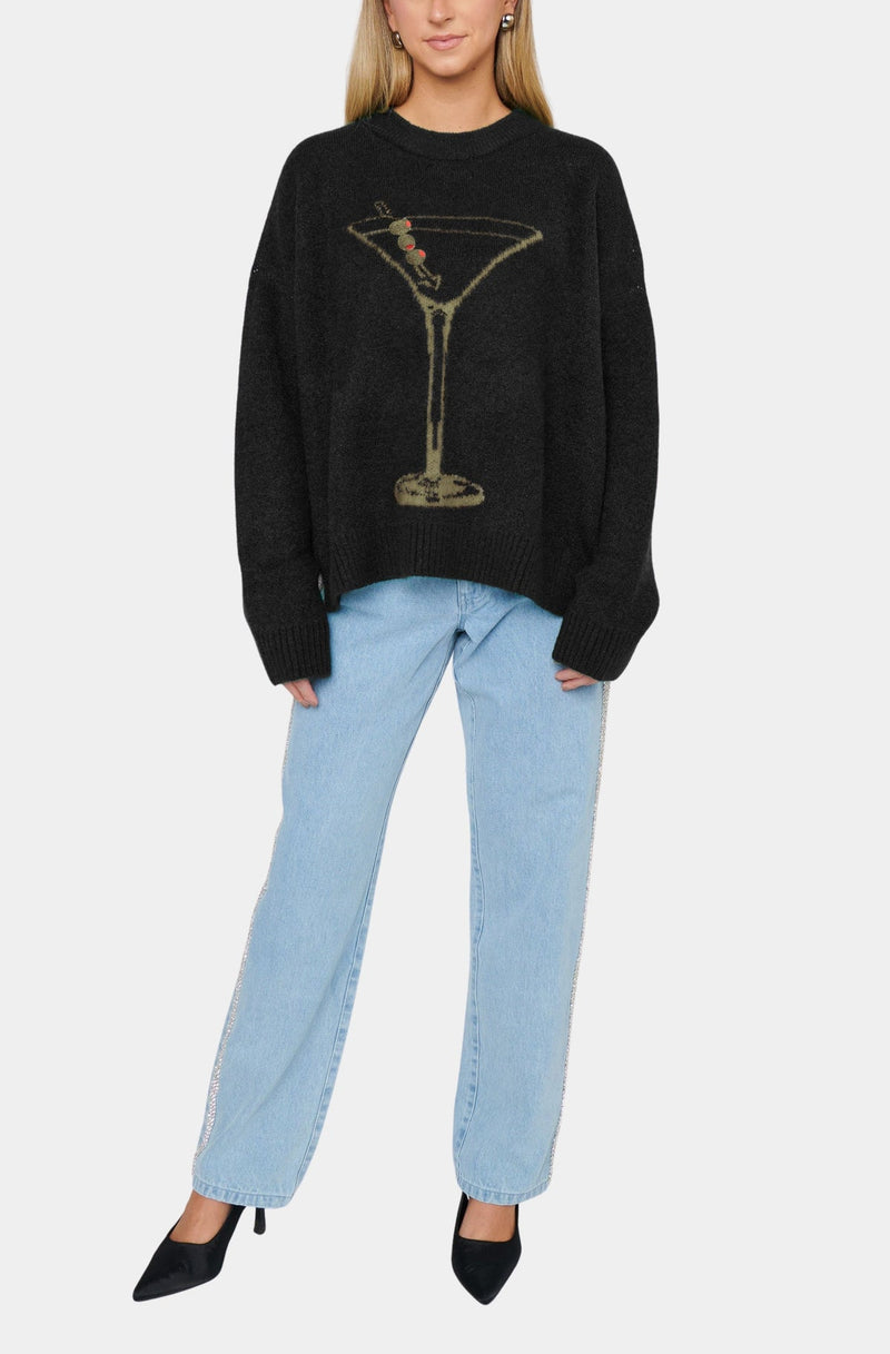 The Settle In Sweater in Dirty Martini Knit is a relaxed crewneck pullover with a soft feel and playful martini glass graphic. Its loose fit makes it easy to layer over tees or wear alone with jeans or leggings for a casual, comfortable look.