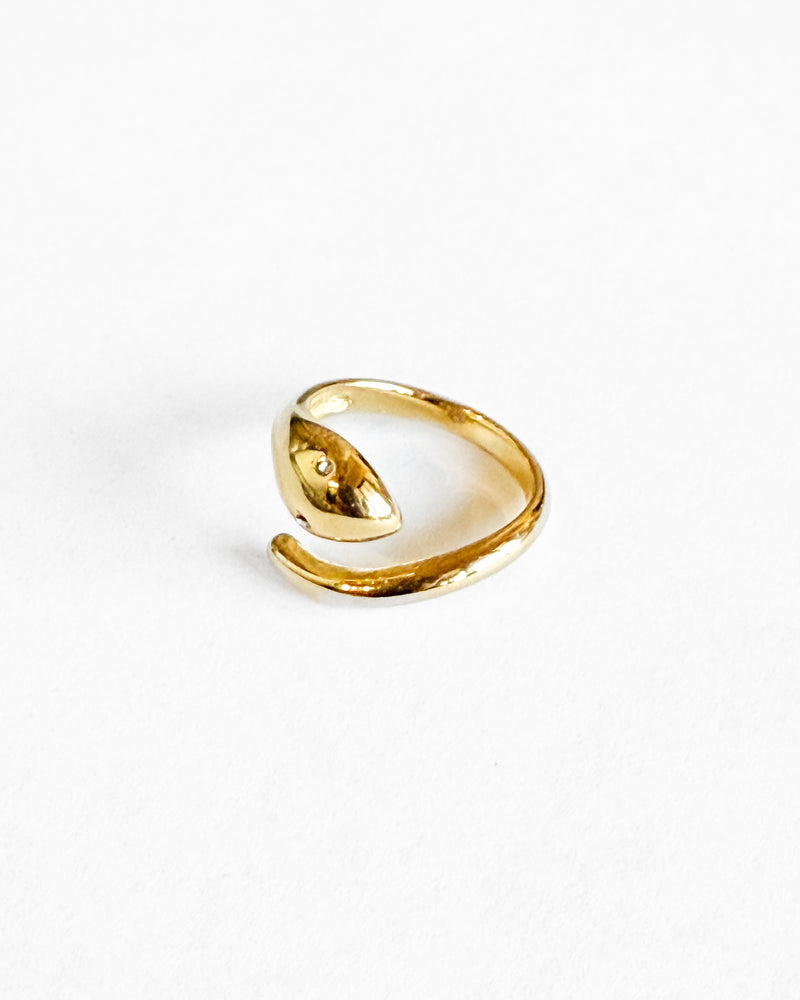 Snake Orbit Ring Elevate your everyday elegance with this striking serpent-inspired band. Featuring a sculptural orbit design that wraps gracefully around your finger, this ring brings a touch of sophisticated edge to any look. The interplay of curves creates visual movement while maintaining the refined aesthetic Care Tucker is known for. Perfect as a standalone statement piece or layered with other rings for a curated, editorial feel.
