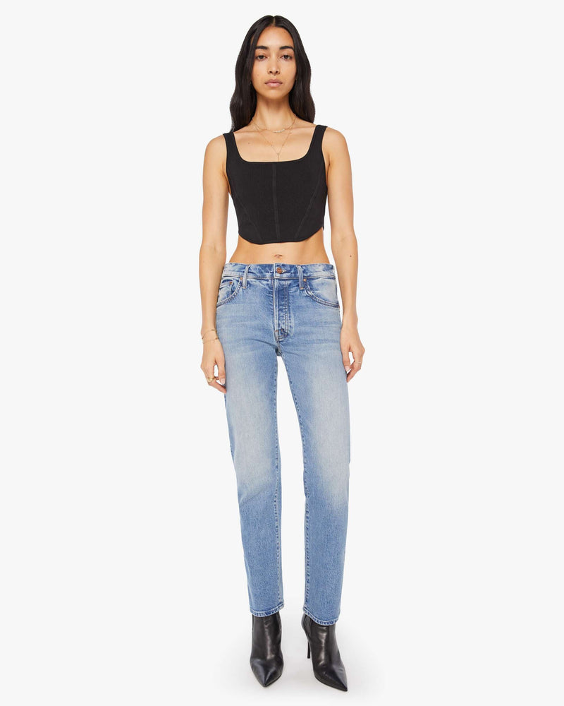 This slim straight-leg was adopted from our men’s line and features a mid rise, button fly, low-set back pockets, a 29-inch inseam and a clean hem. Made from denim with a touch of stretch, Fight For Your Right is a mid-blue with whiskering and fading at the knees.