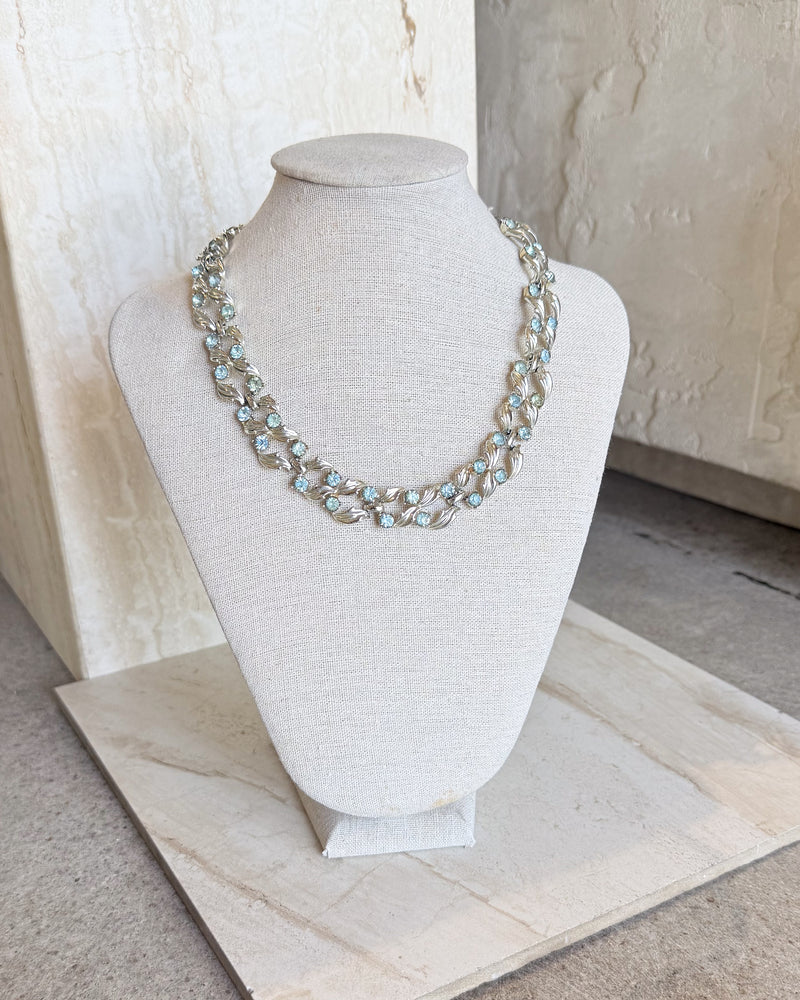 Vintage Coro Baby Blue Rhinestone and Silver Leaves Garland Necklace