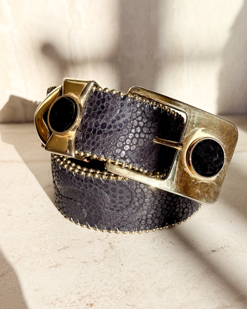 This timeless belt merges classic elegance with versatile style. Crafted from rich black leather and accented with vintage gold hardware, it effortlessly elevates any outfit—from casual denim to tailored separates. The refined metallic detailing adds a touch of sophistication, while the durable construction ensures lasting wear. A wardrobe essential that transcends trends.