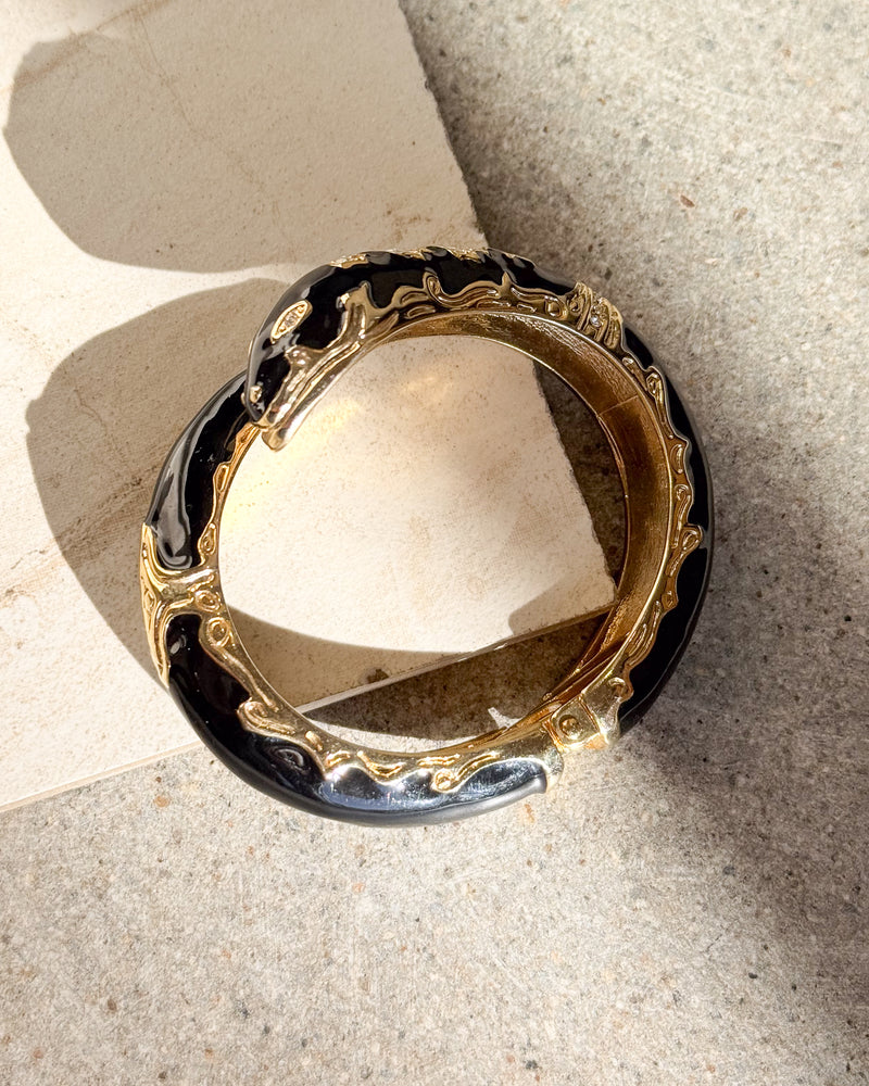 A striking vintage bangle that channels bold, serpentine elegance through its sleek black enamel finish and sculptural snake motif. This piece commands attention with its confident design—the coiled form wraps around your wrist with architectural precision, while the deep enamel coating delivers a lustrous, sophisticated sheen. The snake symbolism adds an edge of intrigue and mystique, making it an ideal statement piece for those who appreciate vintage jewelry with personality and presence. Whether worn alone for maximum impact or stacked with complementary bangles, it elevates any ensemble from understated to unforgettable. A timeless accessory that proves vintage pieces transcend trends and become wardrobe essentials.