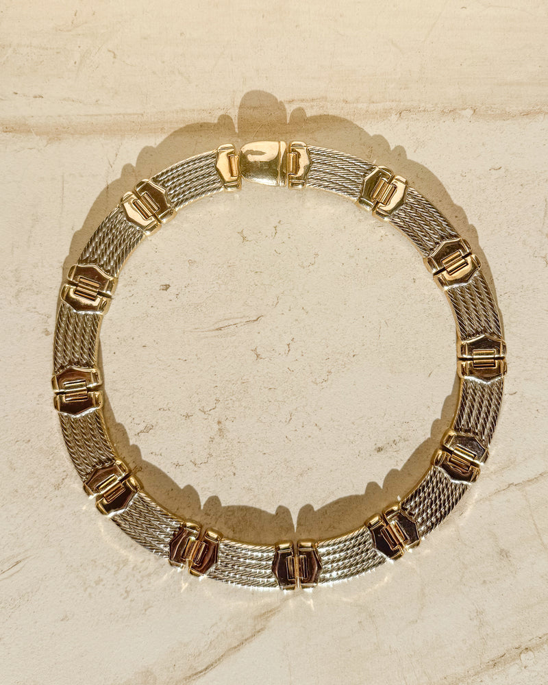 Capture the essence of 1980s glamour with this striking Vintage Gold and Silver Tone Necklace. Combining the warmth of gold with the cool elegance of silver tones, this necklace offers a unique contrast that effortlessly complements any outfit. Its bold design reflects the vibrant style of the decade, making it a standout accessory for both casual and formal occasions. Crafted with attention to detail, this vintage piece adds a sophisticated edge and timeless appeal to your jewelry collection, inviting you to shine with confidence and individuality.