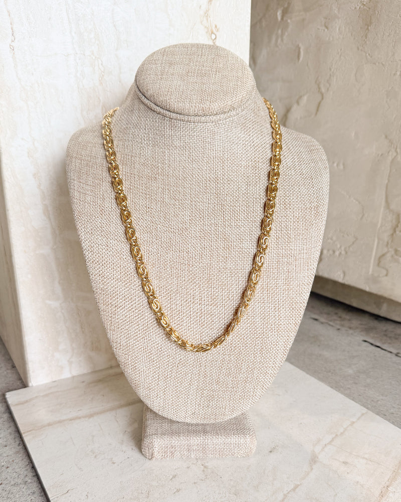 Discover the timeless elegance of this vintage gold Byzantine chain necklace, a statement piece that embodies classic luxury and enduring style. The intricate Byzantine weave—with its distinctive interlocking links—demonstrates exceptional metalwork and architectural precision. Crafted in rich gold tones, this necklace commands attention while maintaining sophisticated restraint, making it equally at home layered with delicate pieces or worn as a bold standalone statement. Its substantial weight and construction promise durability for generations, while the vintage provenance adds character and authenticity that contemporary pieces cannot replicate. An investment in timeless beauty that transcends seasonal trends.