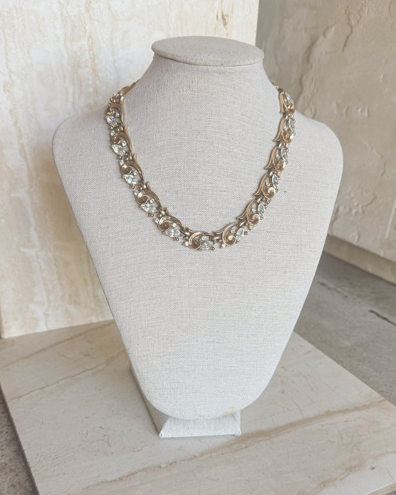 This Trifari vintage necklace showcases a gold-plated curl design paired with clear rhinestone navette accents on each of its 18 links. Each link features a gold-tone curl alongside a shimmering navette rhinestone and two smaller clear round rhinestones. Designed in a choker length, it secures with a fold-over clasp stamped "Trifari" and "Pat Pend," offering a blend of elegance and timeless craftsmanship perfect for making a stylish statement.