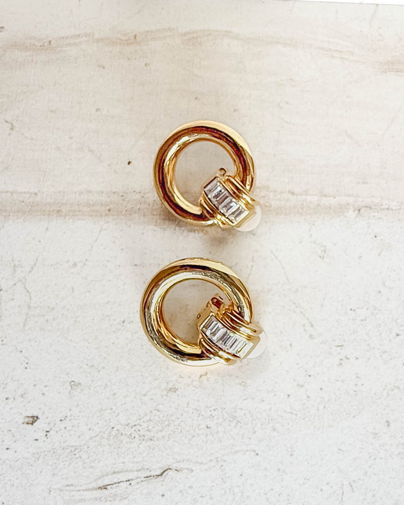 Make a bold statement with these Vintage Gold Tone Large Circle Door Knocker Clip-On Earrings. Featuring a striking oversized circular design accented with clear rhinestones, these earrings capture timeless glamour and eye-catching sparkle. The classic gold tone adds warmth and versatility, perfect for dressing up any look. Designed for comfort and convenience, the secure clip-on style suits those without pierced ears while ensuring a confident fit all day or night. Whether you're attending a stylish event or elevating your everyday wardrobe, these vintage-inspired earrings deliver a unique blend of sophistication and standout charm. Add them to your collection and shine with effortless elegance.