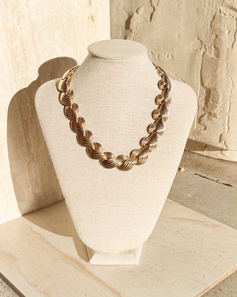 Embrace nature’s elegance with this Vintage Gold Tone Leaf Necklace. Featuring delicate leaf motifs in a warm gold finish, this timeless piece adds a touch of organic beauty to any outfit. Its graceful design makes it perfect for both everyday wear and special occasions, effortlessly enhancing your style with vintage charm and subtle sophistication. Add a unique, nature-inspired accent to your jewelry collection today.