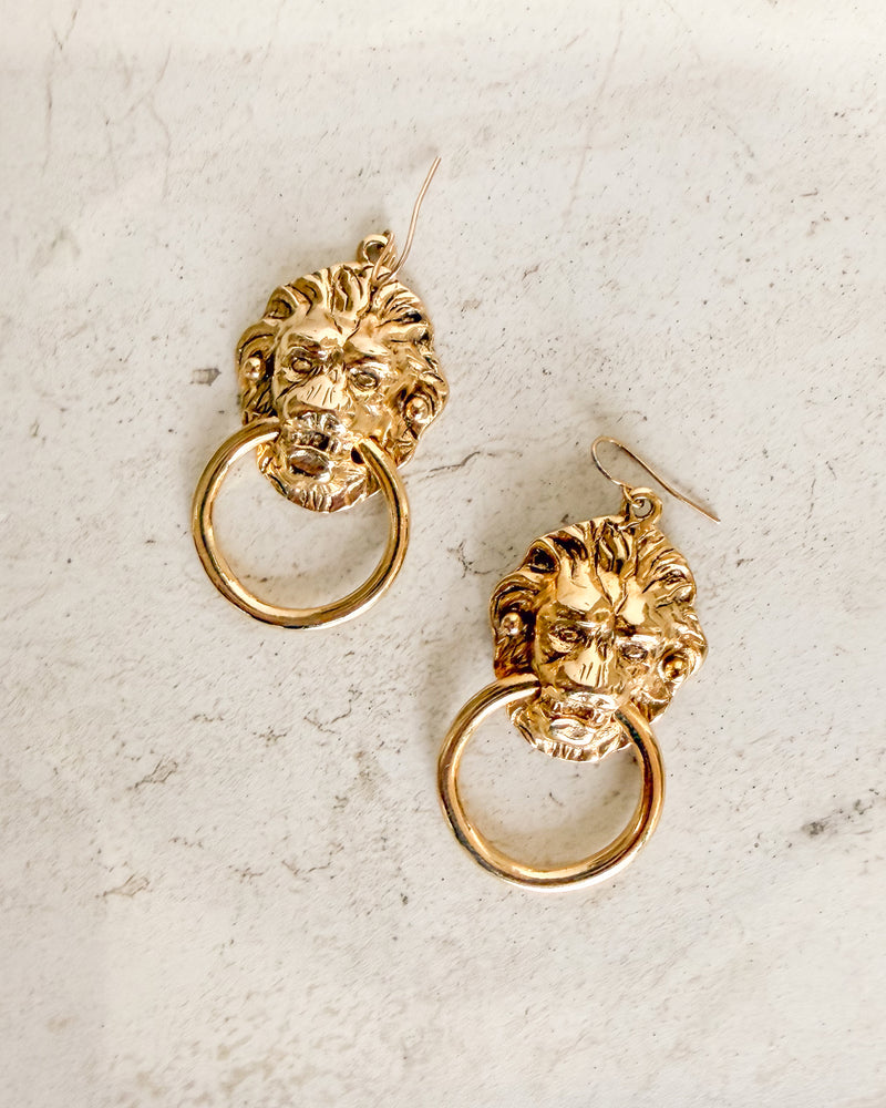 # Extended Product Description Channeling bold, statement-making style, these Vintage Lion Head Door Knocker Gold Hoop Earrings merge sculptural drama with wearable luxury. Each pair features a meticulously crafted lion head motif suspended from a substantial gold hoop—a design that commands attention without sacrificing elegance. The vintage-inspired aesthetic brings editorial sophistication to any ensemble, from tailored blazers to slip dresses. The substantial weight and architectural presence make these earrings a conversation starter, while the warm gold tone complements a range of skin tones and color palettes. Perfect for those who view jewelry as a form of self-expression rather than mere accessory. Elevate your everyday with pieces that feel both timeless and distinctly modern.