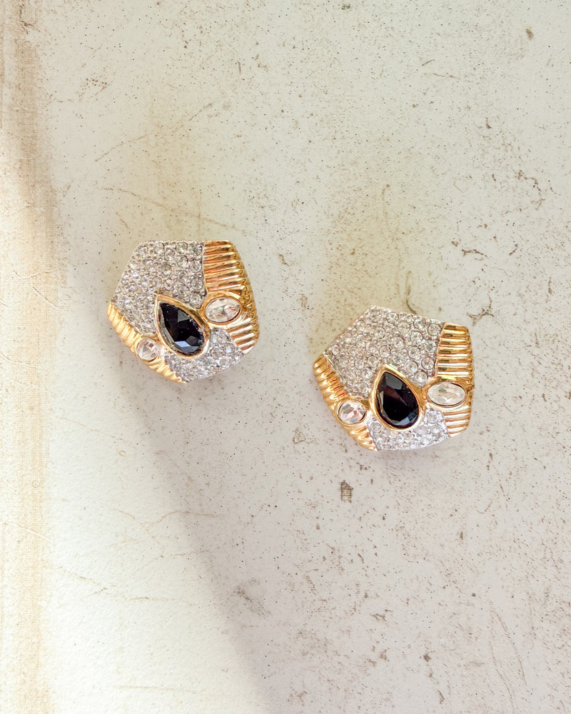 Vintage Signed Rhinestone & Black Cabochon Clip On Earrings