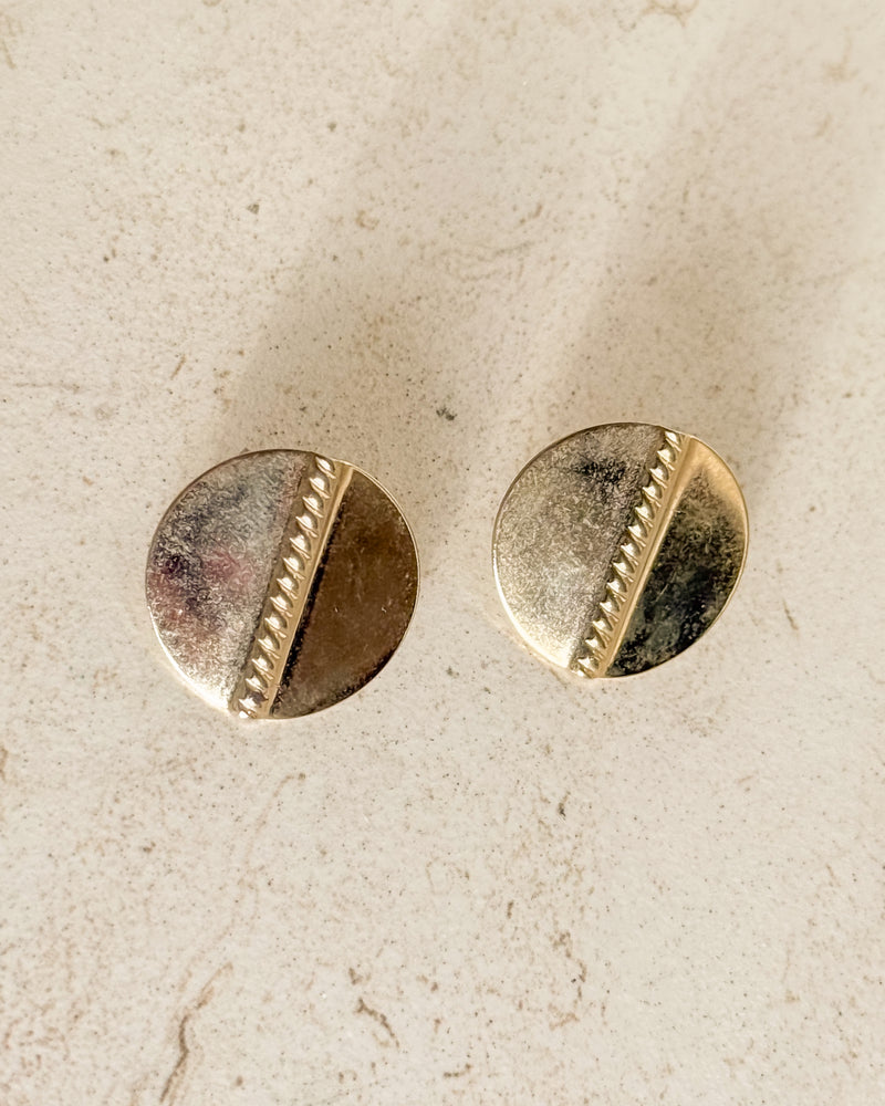 Discover refined sophistication with these vintage textured gold plated round earrings. The carefully crafted surface texture adds visual depth and tactile interest to the timeless circular form, creating earrings that feel both polished and authentically vintage. The warm gold plating lends a luxurious sheen that catches light beautifully, enhancing the dimensional detailing with every movement. These earrings offer versatile elegance—equally at home with minimalist styling or layered with other pieces for a curated look. The vintage construction showcases quality craftsmanship and enduring design that transcends seasonal trends, making them a reliable investment. Perfect for those who appreciate subtle artistry and understated luxury, these textured rounds deliver the kind of quiet confidence that comes from wearing pieces with genuine character. Whether worn as everyday staples or reserved for special occasions, these earrings provide the perfect balance of distinctive design and wearable sophistication that complements any wardrobe.